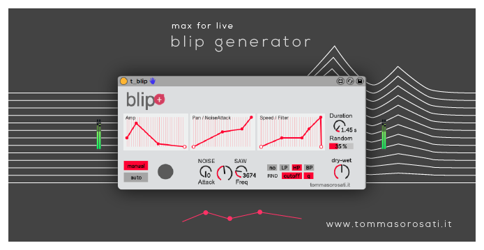 Blip allows you to generate chains of glitchy blip sounds by setting different parameters that make the rhythmic and timbre possibilities almost infinite. The action can be activated either by a dedicated and mappable button or through the peaks of an incoming sound.