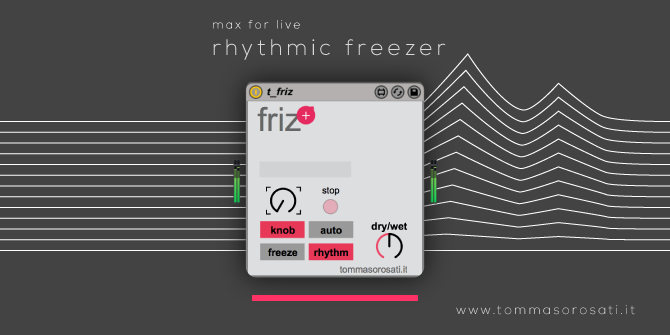 Friz is a max for live device that freeze a buffer of sound and play it changing speed to make rhythmical patterns. It can also simply freeze your sound. Can be triggered manually with a single knob or automatically with the peaks of your sound.